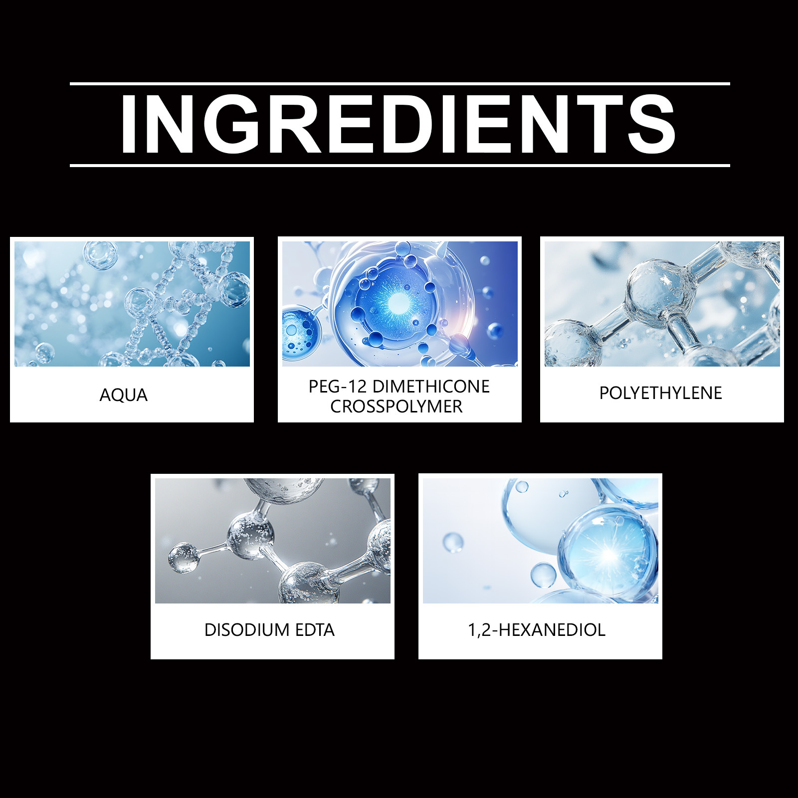 Ingredients: Water, PEG-12 Dimethicone Crosspolymer, Polyethylene Wax Emulsion, 1,2-hexanediol, EDTA-2Na